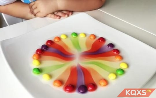 Bạn hãy để trẻ xếp những viên kẹo cứng nhiều màu sắc thành một vòng tròn trên chiếc đĩa. Sau đó chỉ cần đổ nước vào giữa vòng trong của chiếc đĩa và ngồi đợi. Cầu vòng đầy màu sắc sẽ từ từ xuất hiện.