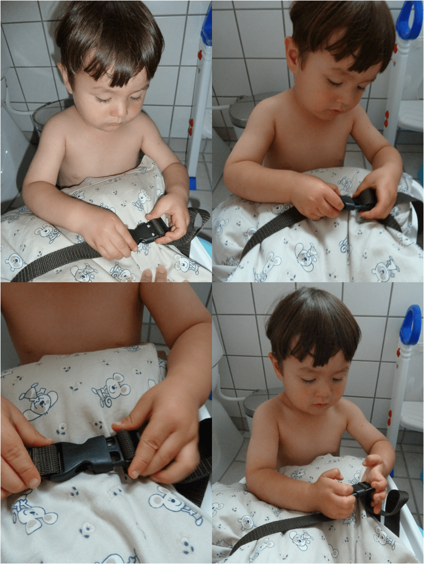 - Chỉ cho con bạn cách mở khóa và cài khóa lại xung quanh một tấm nệm (như hình vẽ)