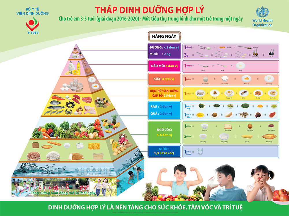 Trẻ ăn cùng với gia đình: 3 bữa chính và 1-2 bữa phụ. Theo Tháp dinh dưỡng hợp lý cho trẻ từ 3-5 tuổi, số lượng thực phẩm khuyến nghị cho 1 ngày ăn của trẻ như sau: